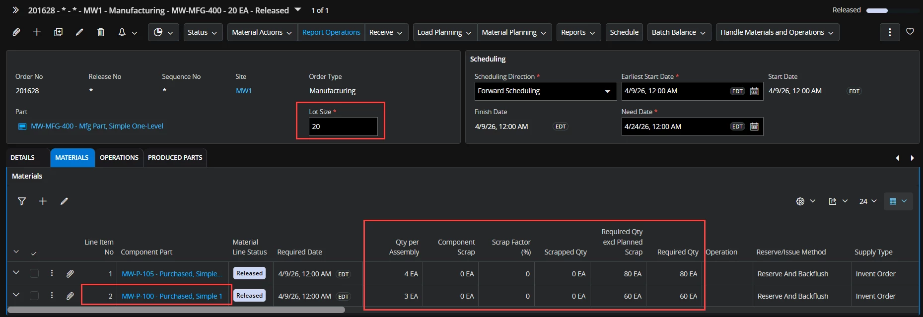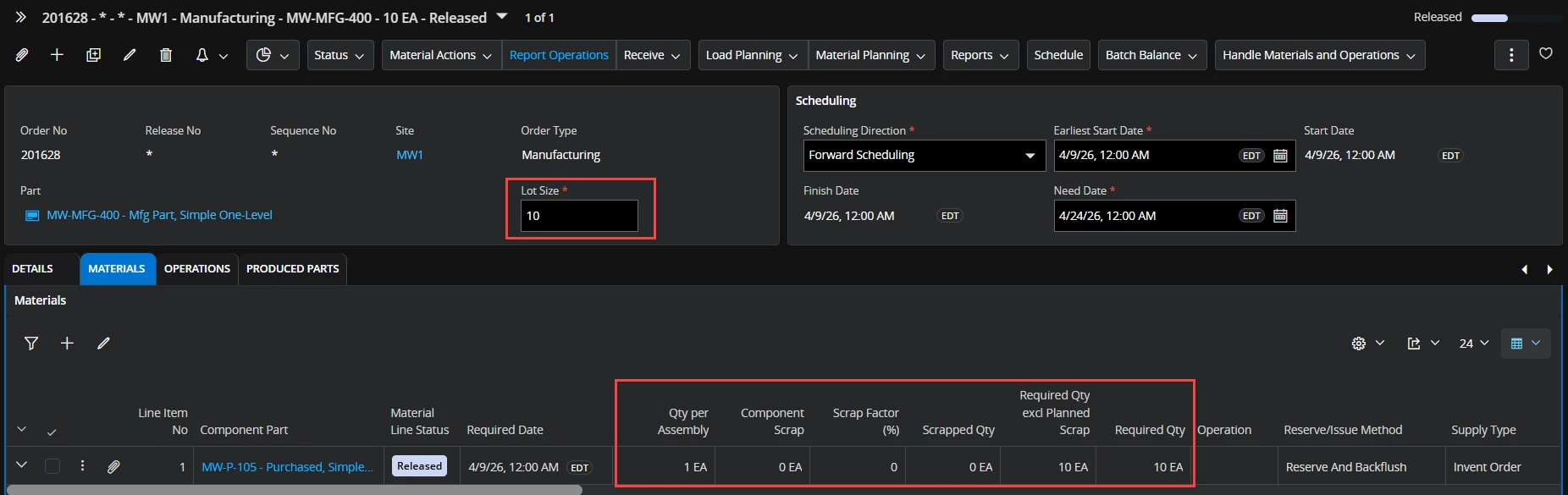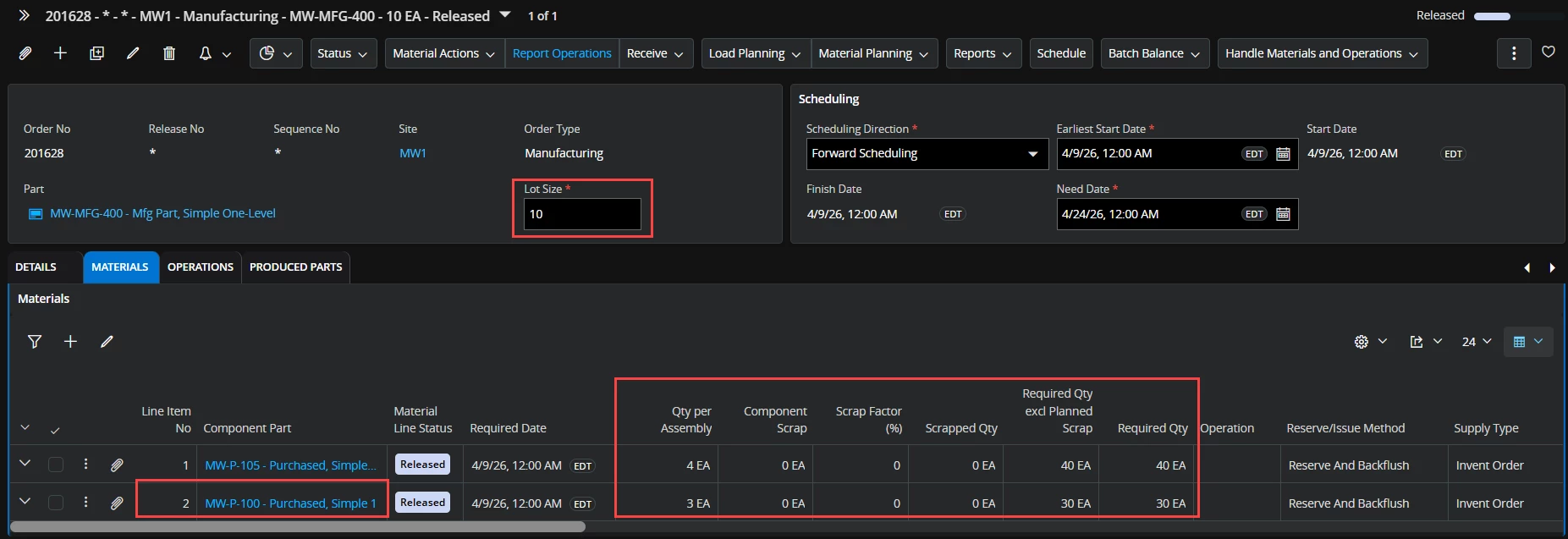 We have recently upgraded to Cloud version 25R1 - previously we used version 22R2… my planning colleagues say that if they manually amend the materials requirements on the shop order (to remove or replace or add a component for example), then if they subsequently change the lot size, the material components requirement revert to the effective revision structure and so undoes the previous component changes, reinstating the components before the earlier change but relative to the new lot size. Effectively, there is a re-explosion of the effective structure based on the new lot size