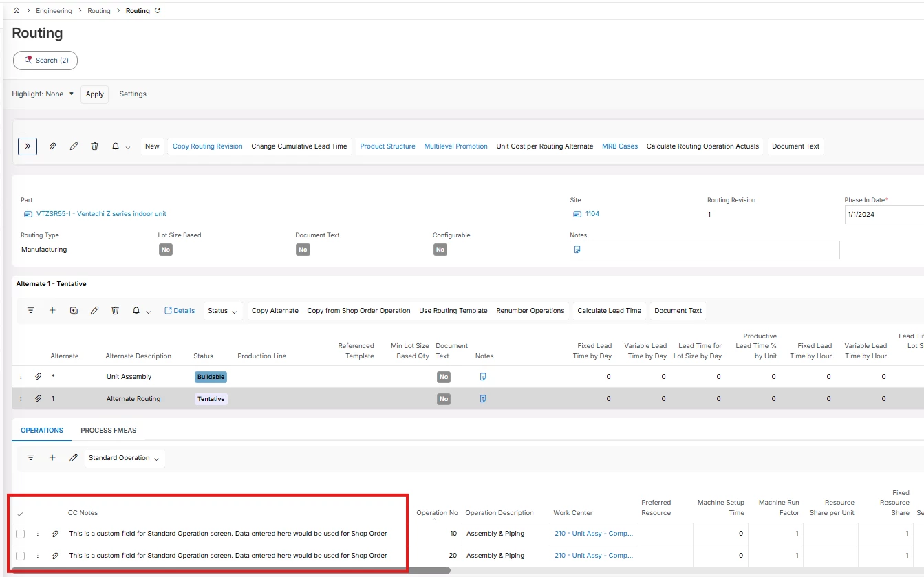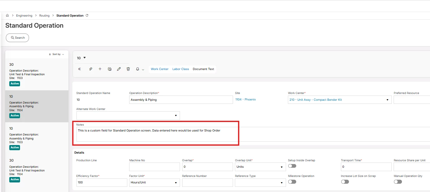 We’re successfully created a custom note field on the Standard Operation page, with it being brought to other pages via expression/reference custom attributes as well. The field is called Cc Operation Definition