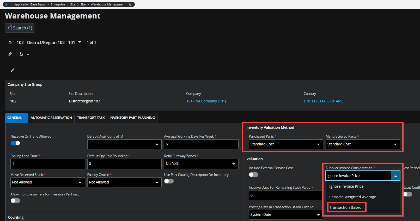 When I transfer a configurable part to his site I have the message: transaction based in combination with inventory valuation method weighted average is not allowed for configured parts. How can I disable this message/setting that I only have on one site and not on others?