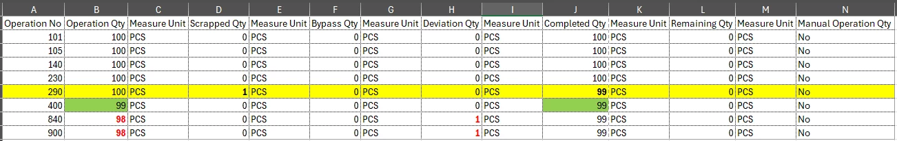 As soon as the operator reported the correct Completed Qty, the system created a deviation. The downstream operation inherited the same reduced Operation Qty and continued to show the same deviation, even though the actual physical quantity was correct.
