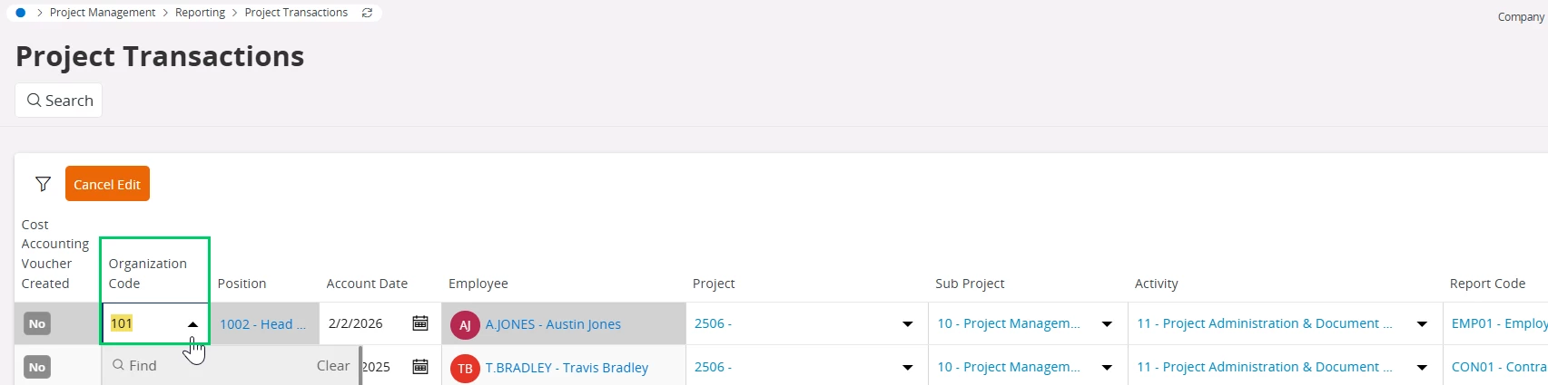 We observed that when the Cost Accounting Voucher has not yet been created for a project transaction, the Organization Code in the record can still be changed. This is possible even when the employee is already assigned to a specific organization and position in the system.