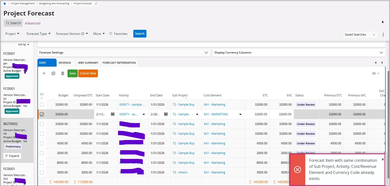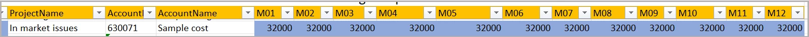 I want to create a project forecast for 12 months for the same sub project and activity and cost element like below picture,