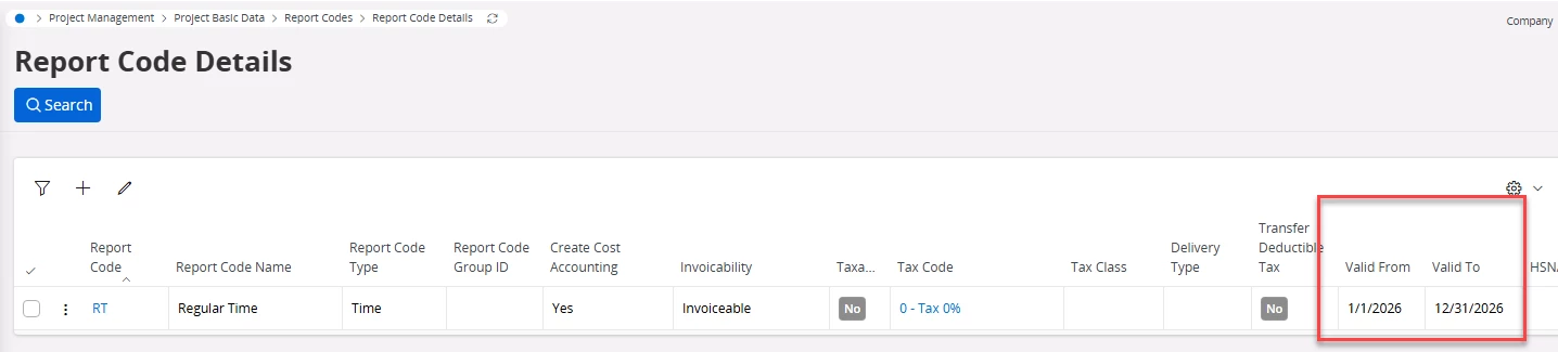There is a scenario where a report code is valid from 01/01/2026 to 12/31/2026. These validity dates are maintained consistently in both the Report Code and Report Code Details windows. The Standard Internal Price is also defined using the same validity date range.