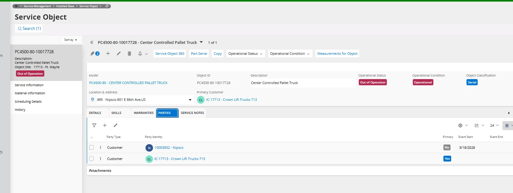 The object is tied to 2 parties, the internal customer and an external customer. As time progresses as this object goes on rent and off rent there will be multiple more Party’s. The object’s location is currently at the external party’s location.