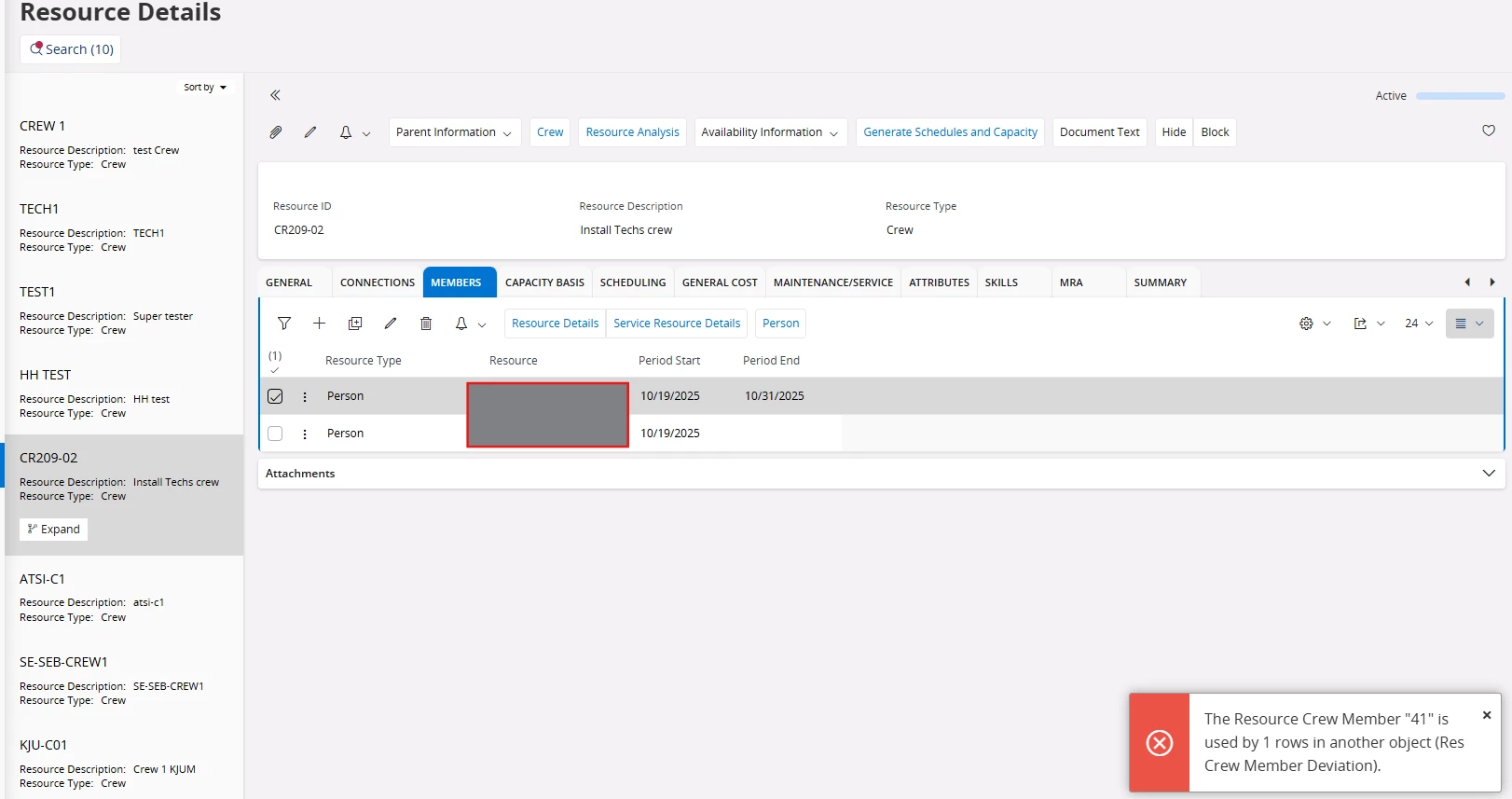 When I tried to delete a crew member I get a error message. The member period is already over. Still I cannot delete the resource. The error says about Crew Member Deviation but there is no any deviation related data. Also I have no idea about this resource crew member number. What is that number?