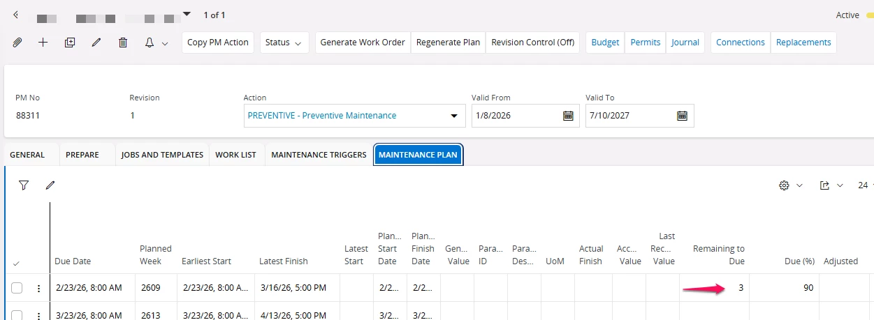 But in the Maintenance Plan, the remaining to due field shows the number of days as 3 including the weekends. If we have the WO generation lead time as 3, then I’m able to trigger the WO using database task. I believe the due date and remaining to due fields must exclude weekends as per the calendar but can someone please confirm if this is the expected behavior?