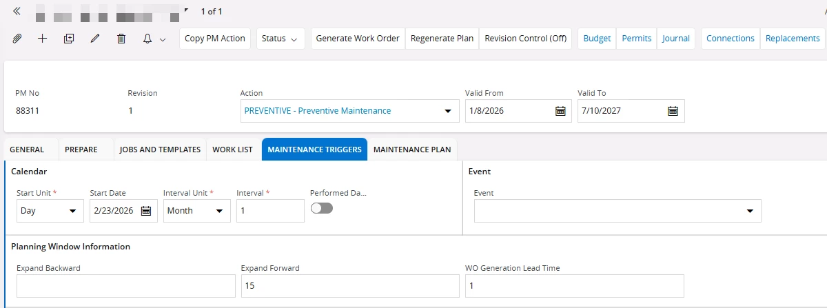 For example: The start date in the maintenance trigger is set to 23/02/2026 and the WO generation lead time is set to 1. The expectation is the Due Date should be considered as 20/02/2026 and automatically generate the WO based on the database task scheduled which does not work.