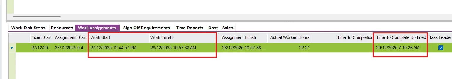 The work task was completed on 28/12/2025 via the mobile work order; however, the status update in the IFS application was delayed by one day.