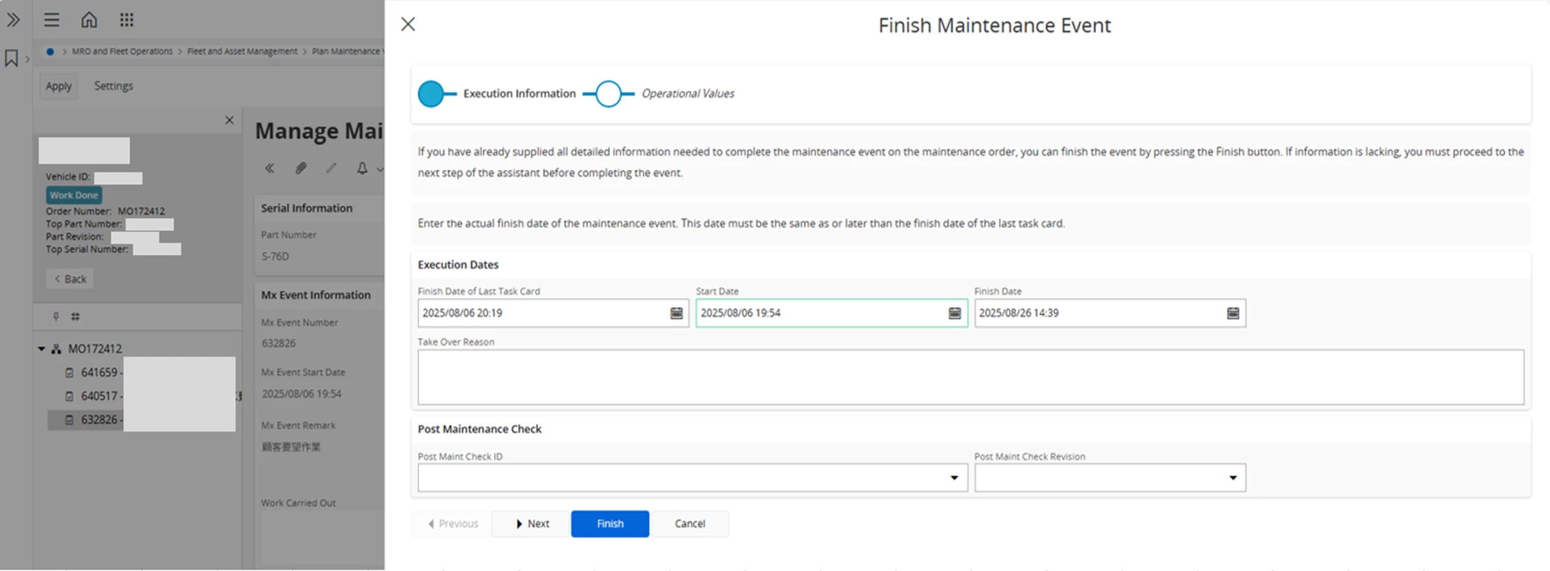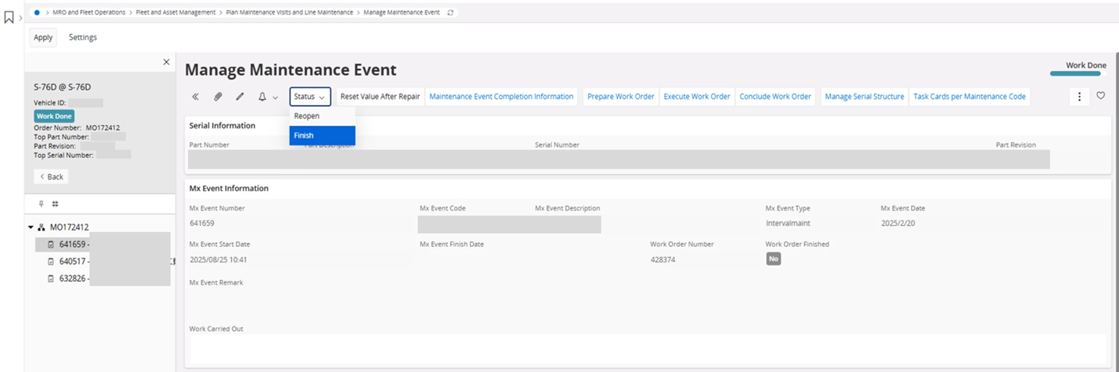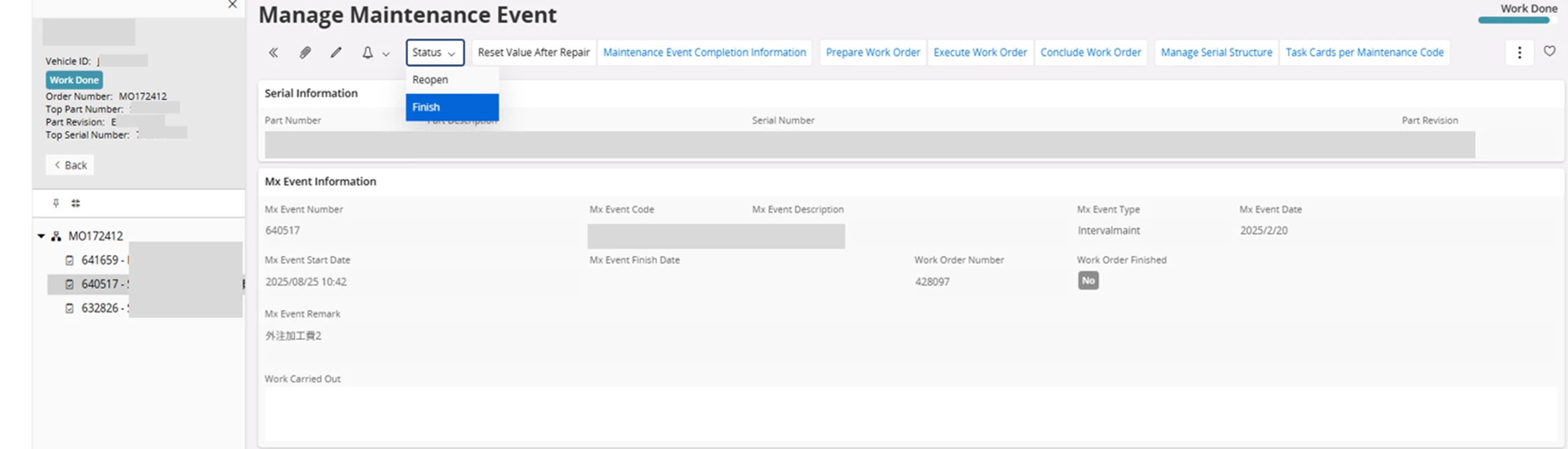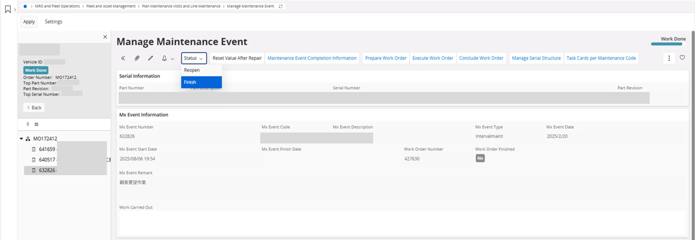 the Manage Maintenance Order itself was marked as “Finish,” and the data moved to the Maintenance Order History.