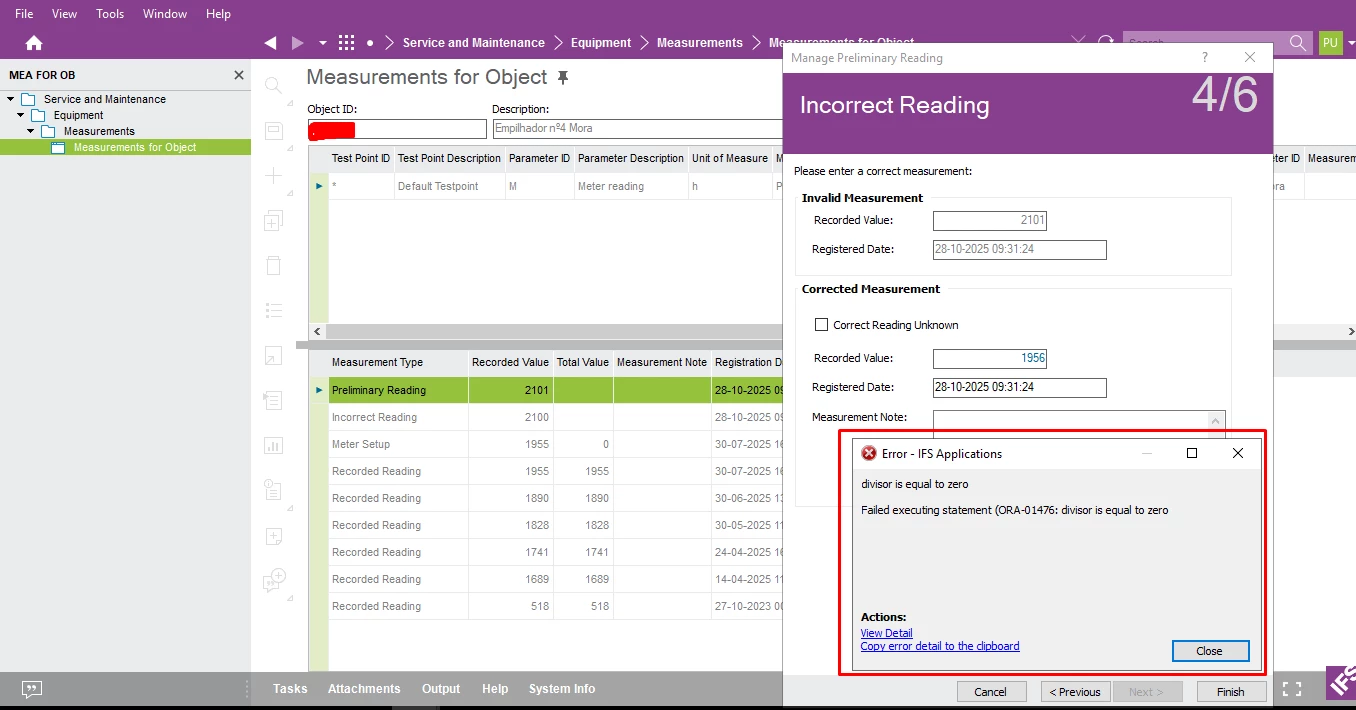 Ifs.Fnd.FndSystemException: Unexpected error while calling server method AccessPlsql/Invoke ---> Ifs.Fnd.FndServerFaultException: ORA-01476: divisor is equal to zero
