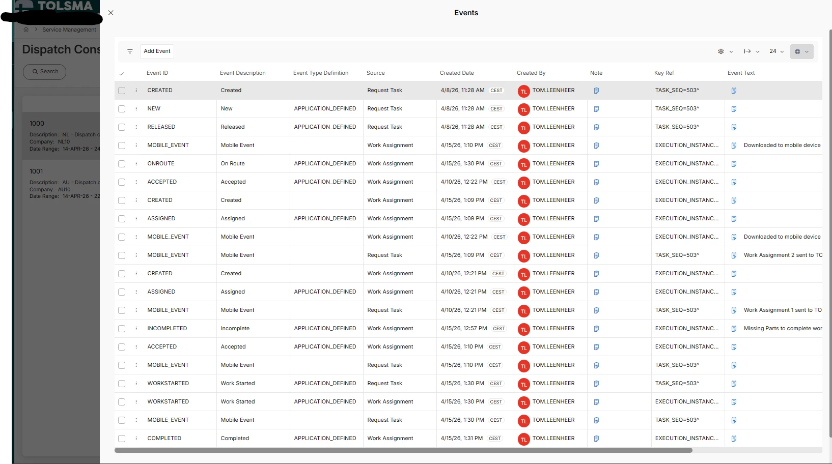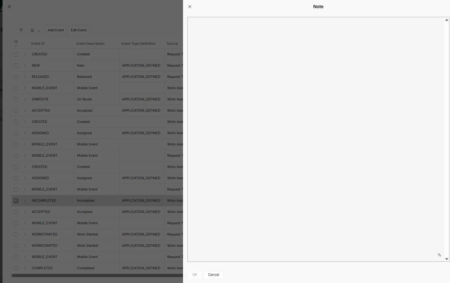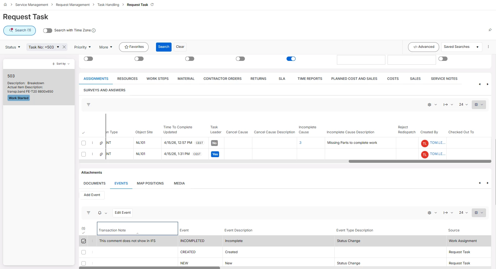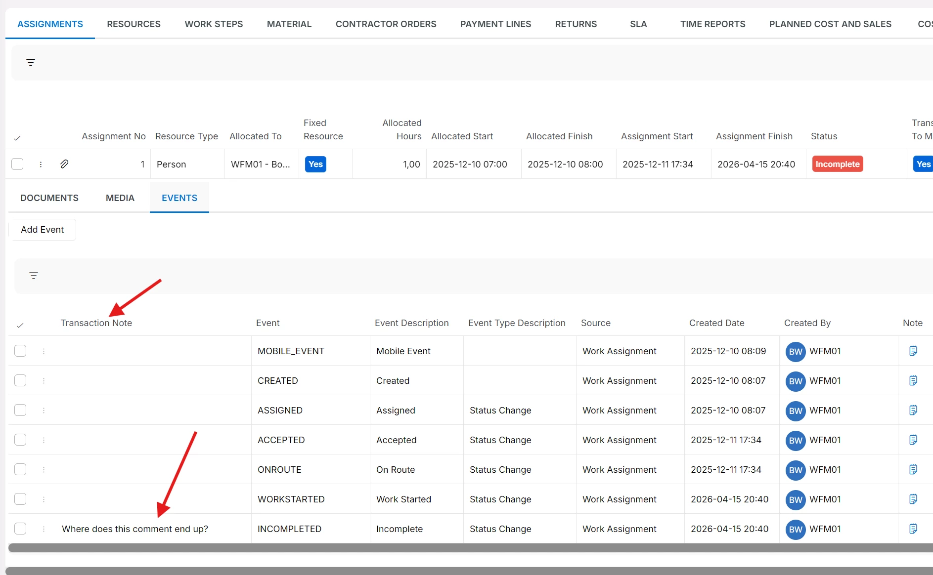 Its not shown on the Work task assignments line on the Task and also not shown when you click on the task in dispatch console and go to Events. (the notes are empty in the events log)