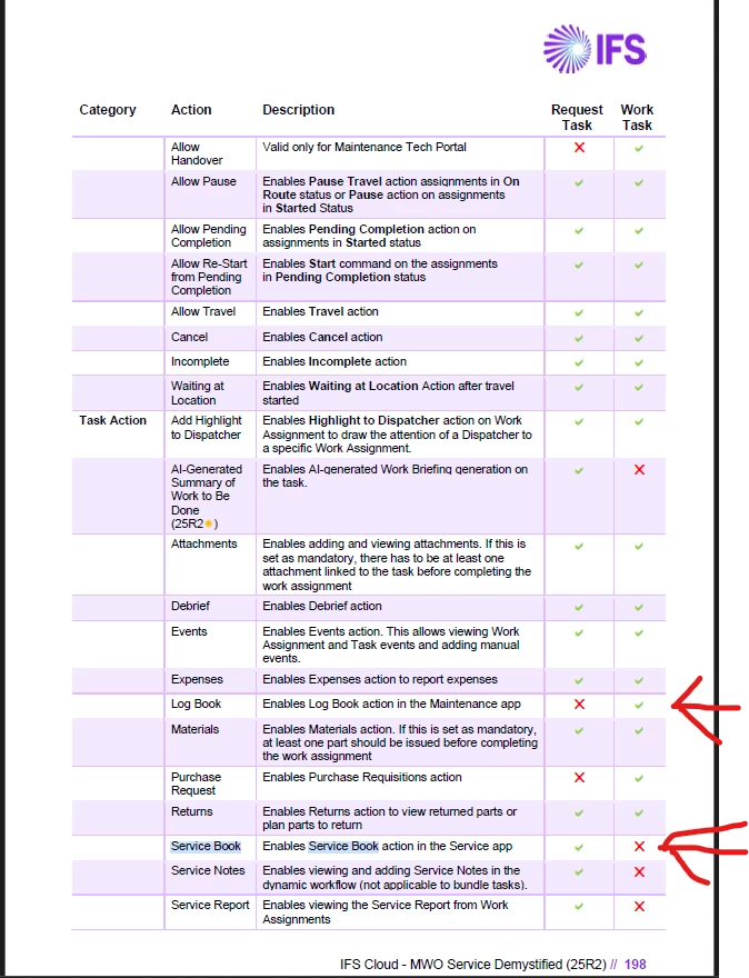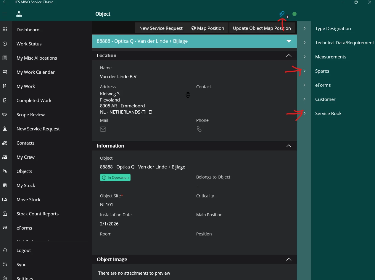 If i go to Objects i can download the Service object and see the customer, service object, the attachement connected in ifs on the service object, but not the Sparepart list and Historical Request task in the service book.
