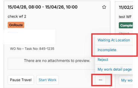 I see that both “Waiting at Location” and “Incomplete” appear there as available states. This makes it unclear why these actions do not surface in MWO when the Configured Work Task workflow is used.