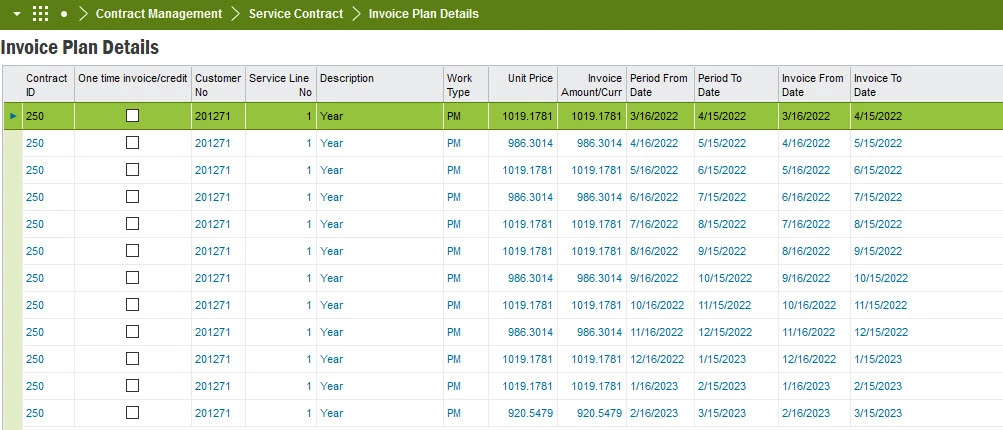 We have an issue, for Service Contract, we would like to have the yearly service fee to be evenly distributed to each month, for example, we charge customer 12000 a year, then the billing invoice for each month, should be 12000/12=1000 per month.