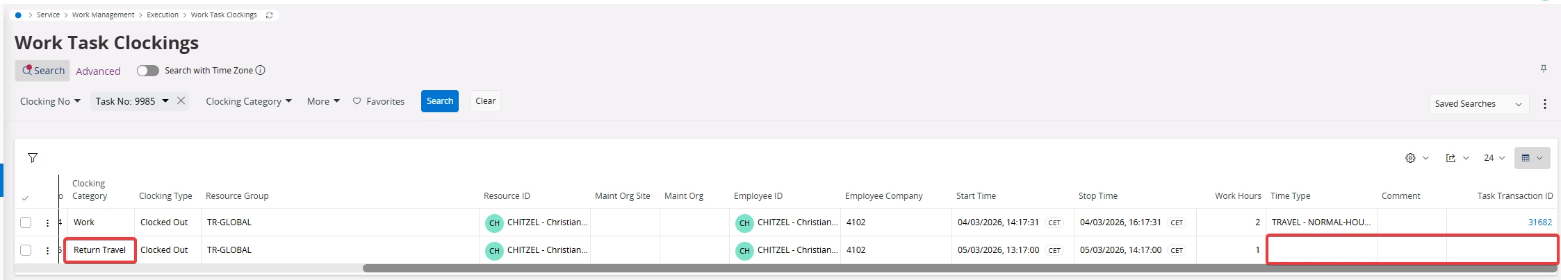 the “Return Travel” function when completing a RWT in the MWO Service Classic App, creates an entry in the “Times” Action Tab and in the Work Task Clockings in IFS Cloud.