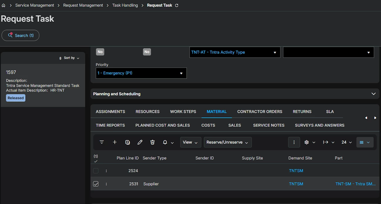 The Issue/Unissue option is not visible on the left side of the Reserve/Unreserve option in the request task->Material