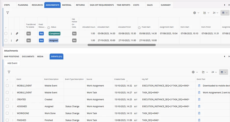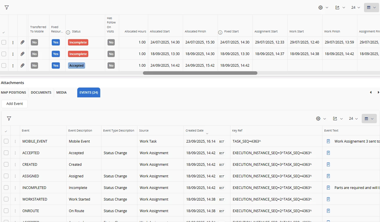An issue is arising in Cloud (24R1) where Work Tasks are disappearing from the engineers mobile that were previously Assigned/Accepted. There seems to be no consistencies to Work Tasks this is occurring on, or time frame.