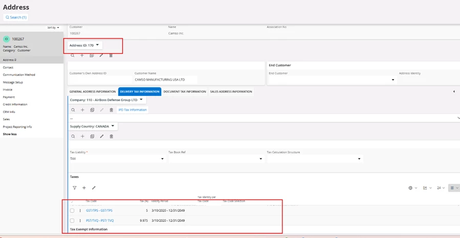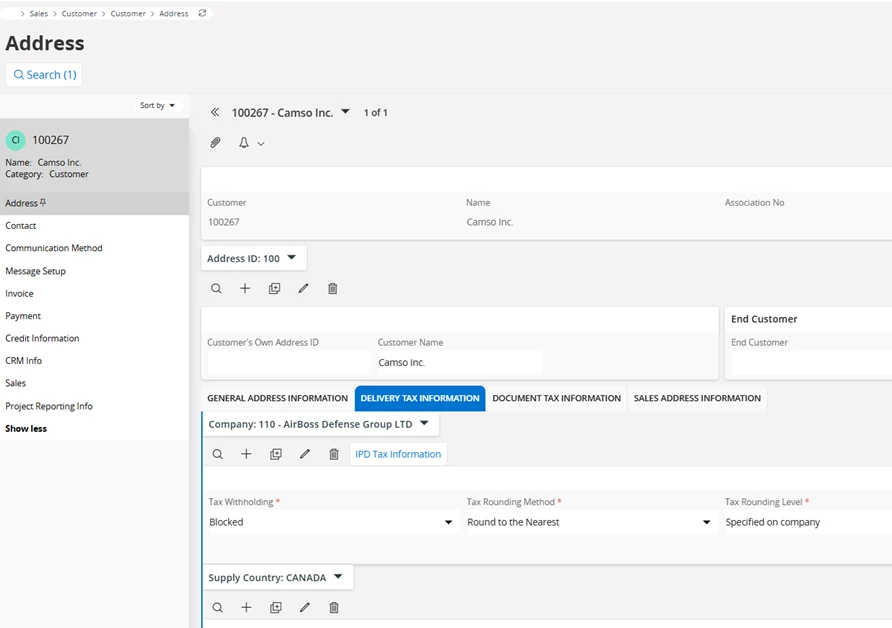 Sales > Customer > Customer > Address > Delivery Tax Information tab