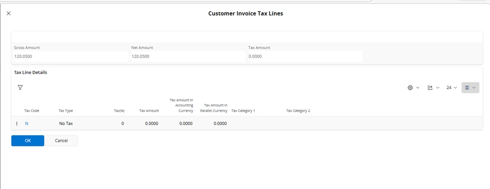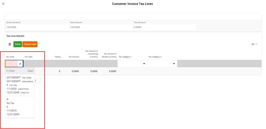 When we go to tax lines, we are not able to see all the tax codes to choose the correct one. In the dropdown it shows just these 2 tax codes.