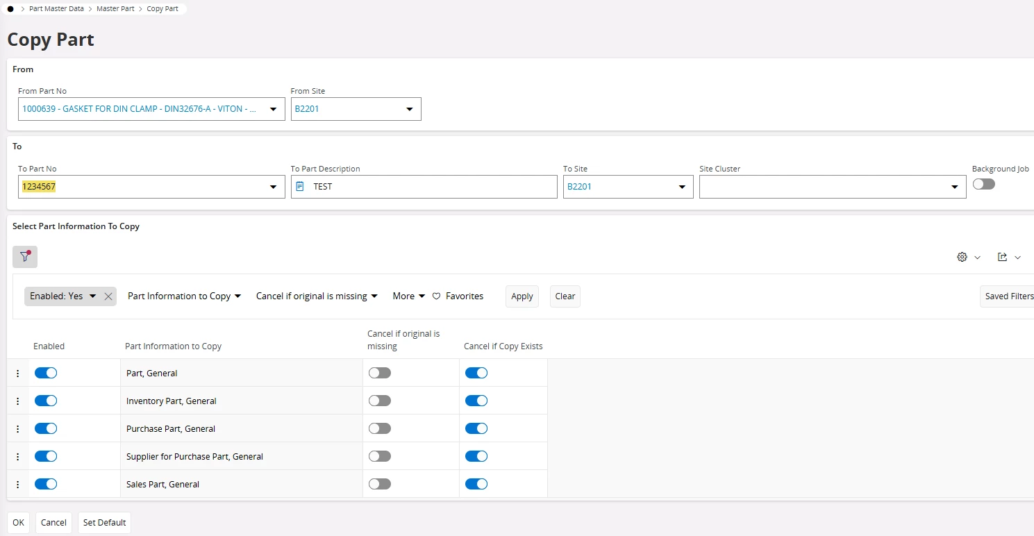When performing Copy Part in IFS Cloud, all general information from the existing part is copied to the new part, including Estimated Cost, Minimum Quantity, Dimensional Quality, Safety Stock, and Lot Size.