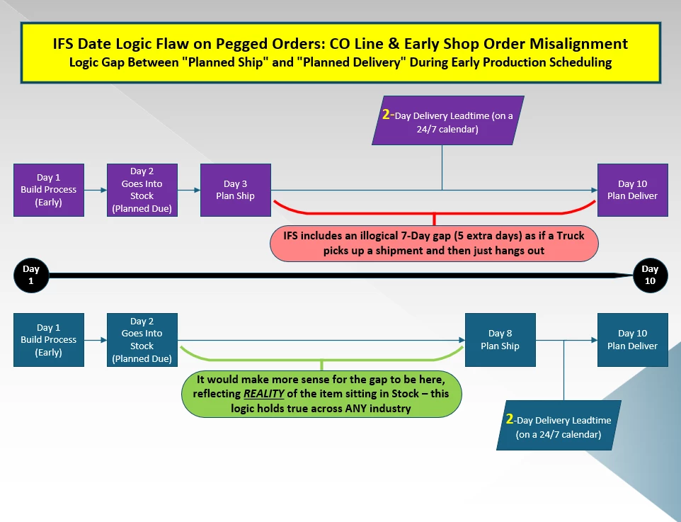 The Logic Flaw: IFS currently treats the Planned Ship Date as the "earliest possible" date rather than the "required" date based on Planned Delivery. This creates a logical paradox in the system.