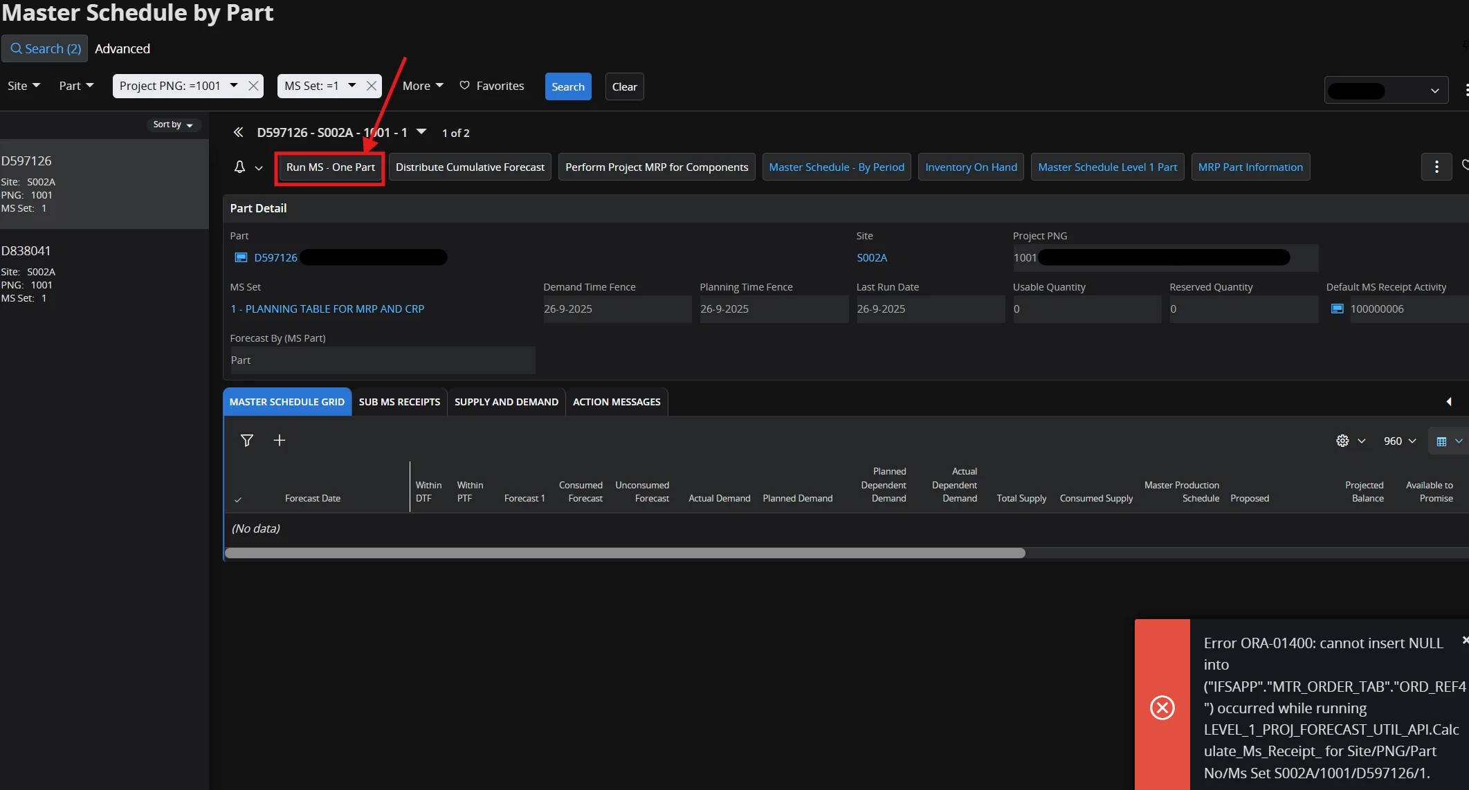 - Run the process for another part or MS set: If the issue doesn’t occur elsewhere, it’s likely data related (specific to the part, site, or forecast combination).