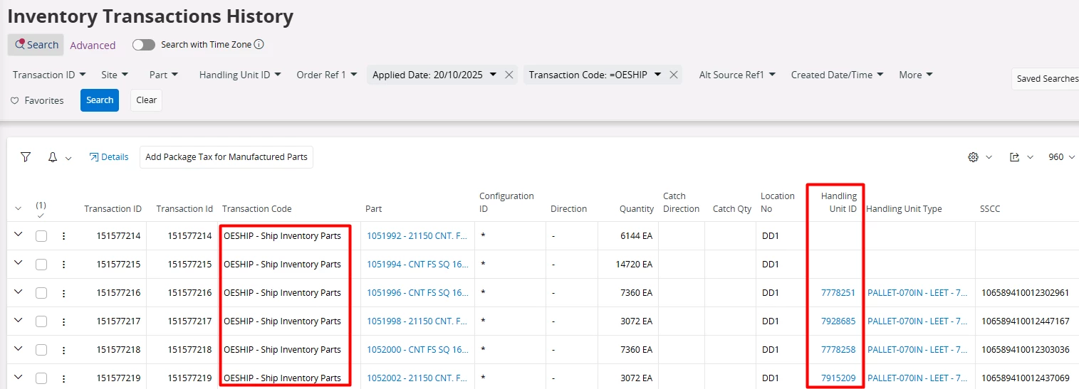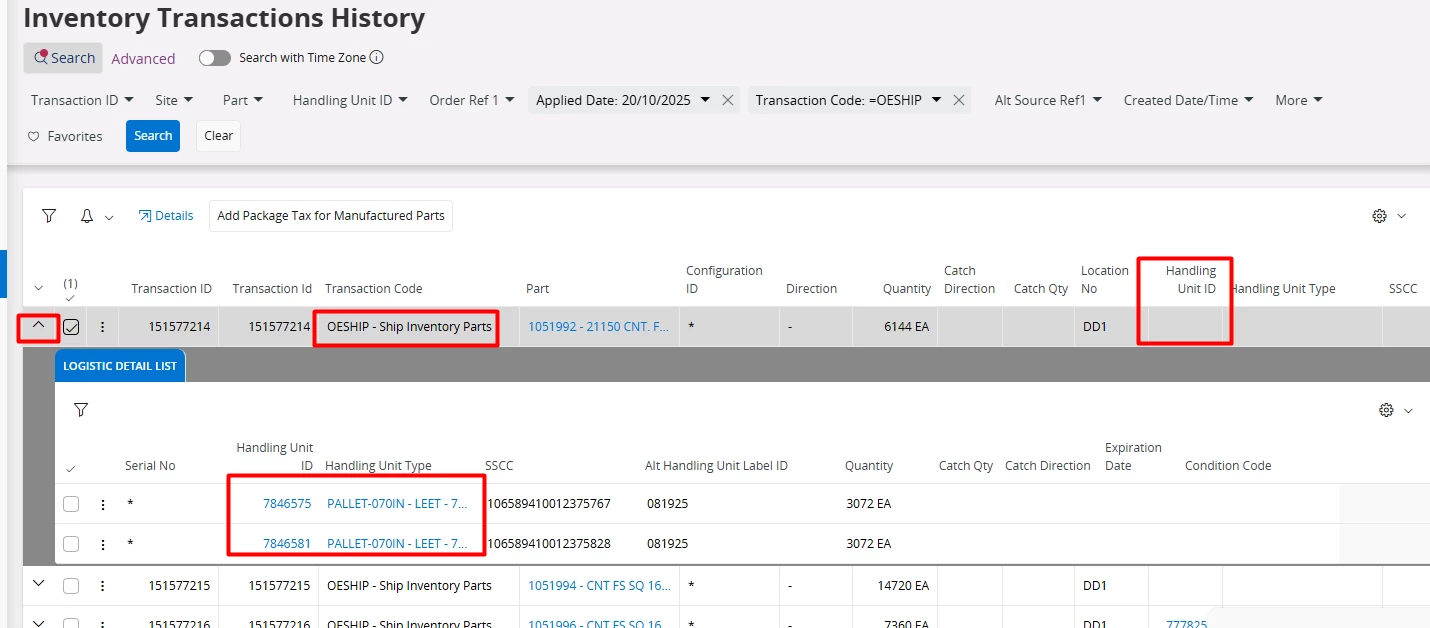 If I select the dropdown for the lines that Handling unit ID is not visible, all the handling units that shipped from the part and lot batch is visible in there. I think IFS sort handling units from Source ref, part and lot batch number. But If I query for that handling unit ID, OESHIP transaction is not coming up.