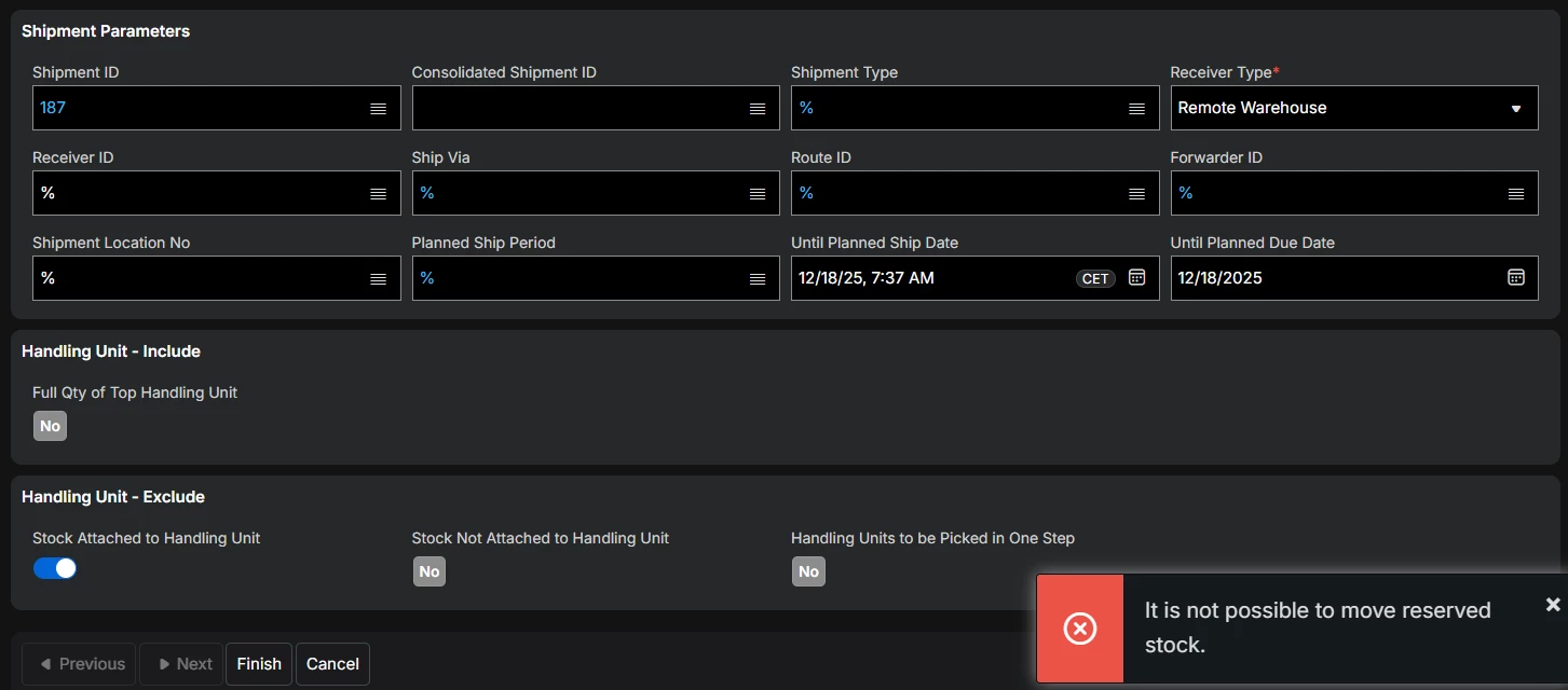 On clicking finish, transport task fails with the reason reserved qty cannot be moved but all the qty in stock is not reserved for any tasks across the site.