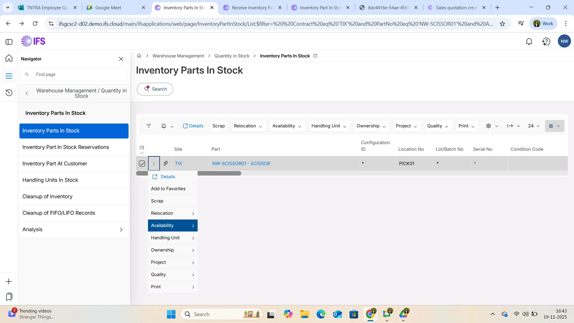 The Reservation details option is not available , why it is like that ?, even i have checked in Inventory Part In Stock Reservations window but my part is not available.
