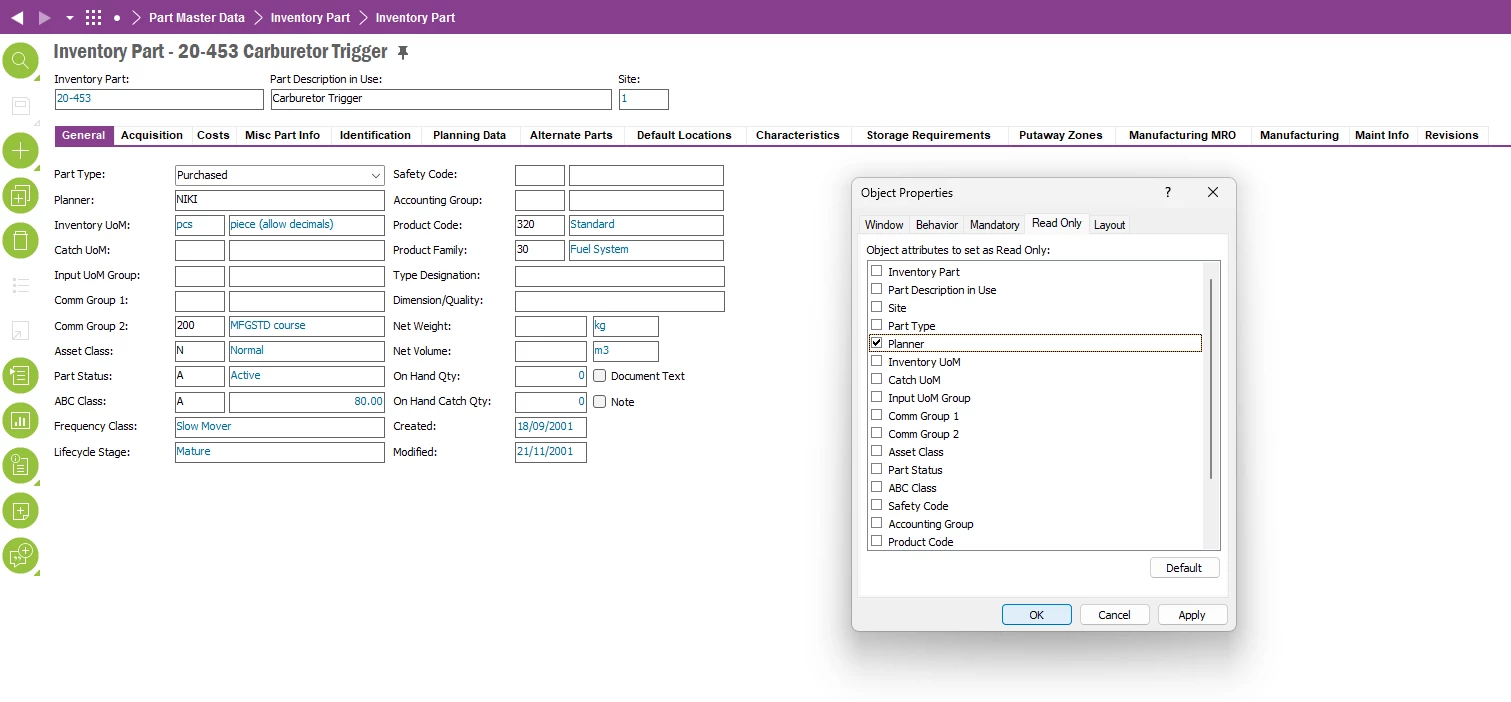 How can the Planner Field on the Inventory Part - General Tab be made RO?  We have users that are entering other information but we do not want them to have the ability to update the Planner.