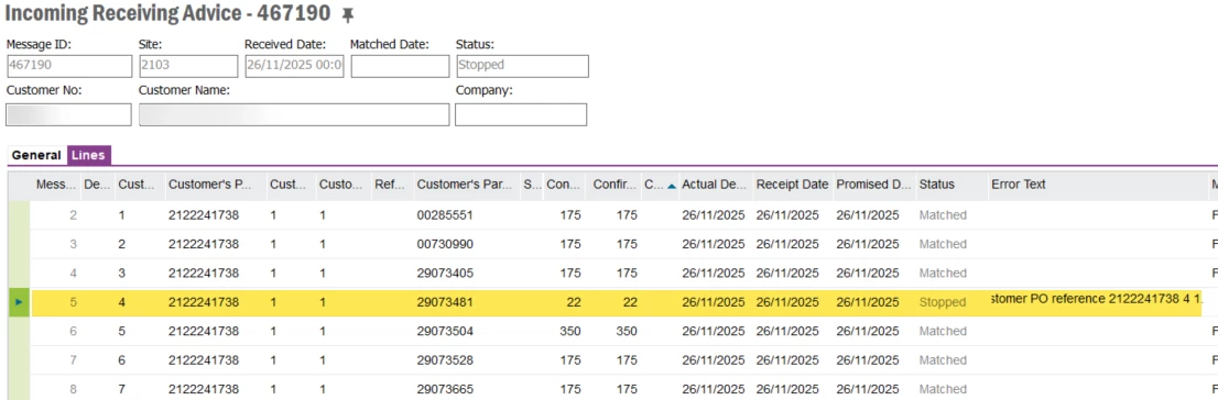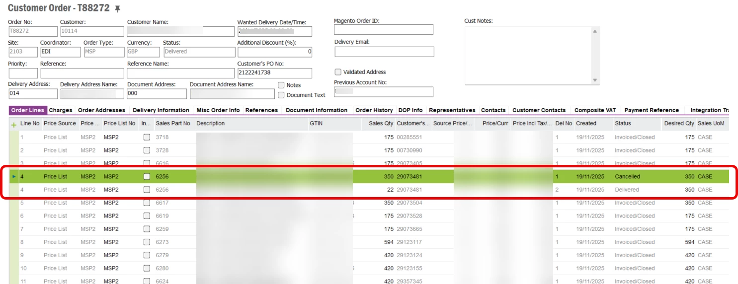I’m currently unable to complete the POD matching process for the customer. When the order was generated, one line was deleted and replaced due to an incorrect process. As a result, the customer will not accept the POD match, and the invoice cannot be generated.