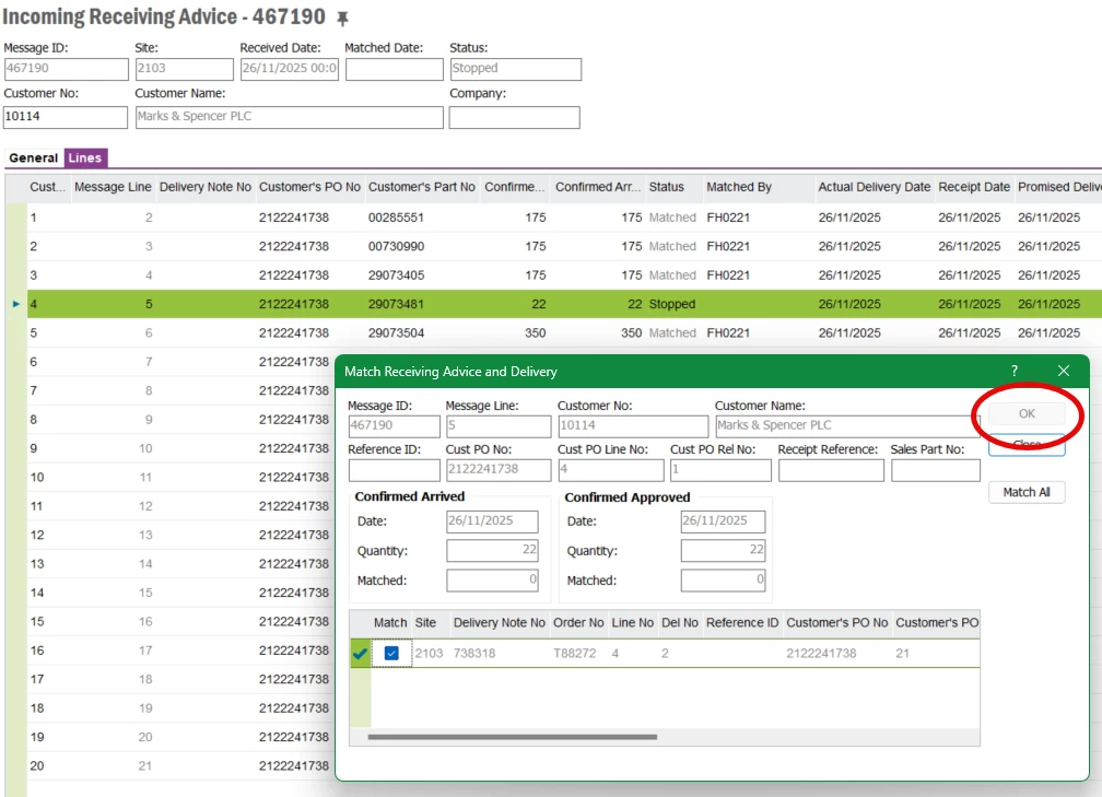 I attempted a manual match for the line item 4 as shown on the screen, but the OK button remains disabled.