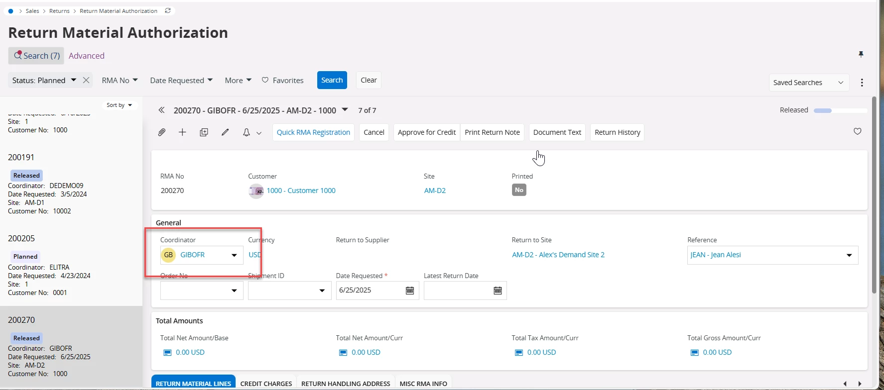 Beyond status control, the Coordinator field supports ownership, tracking, filtering, and reporting, and it only gains additional functional significance if custom workflows, event actions, or extensions are configured to reference it. In essence, the Coordinator is the person the system holds accountable for validating the return, authorizing the warehouse to receive the goods, and ultimately approving the financial credit issued to the customer.