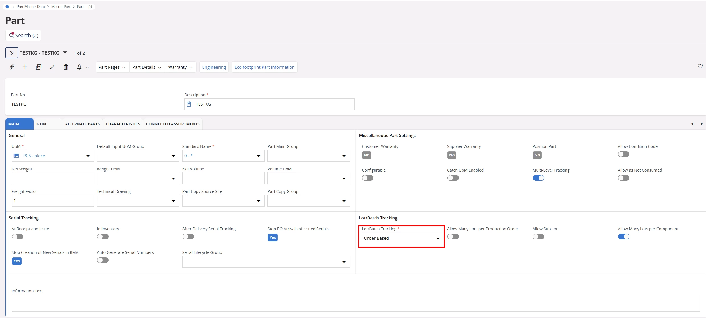 Can you please double-check whether the ‘Lot/Batch Tracking’ has been set to ‘Order Based’ for the related Inventory Part. It could be found in Part Master Data> Master Part> Part, under Main tab (please see below screenshot). If ‘Lot/Batch Tracking’ has been set to ‘Lot Tracking’, then the user has to manually enter or generate with values that might not match the order number.