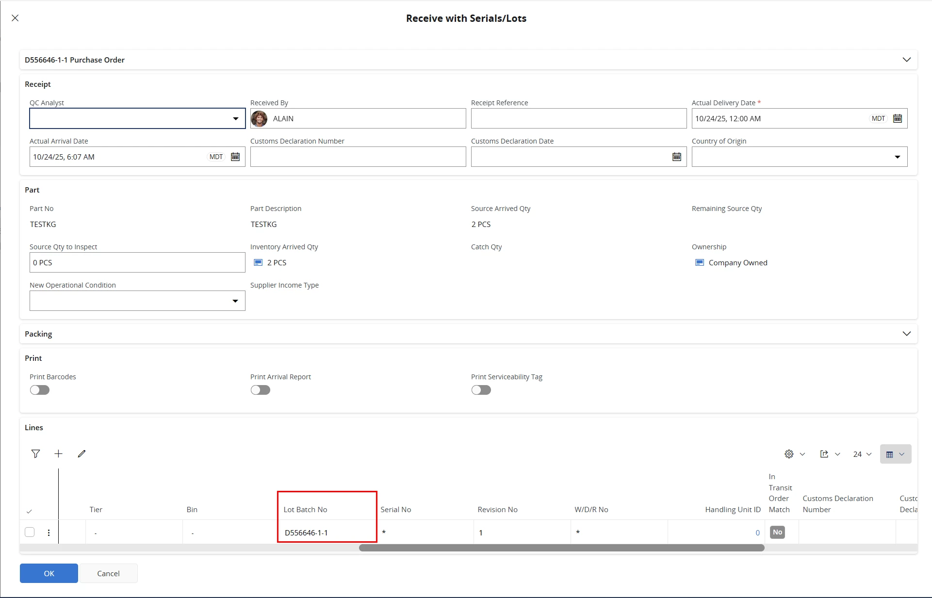 When performing a receipt of an order based item use the Receive with Serial/Lot no button, we were used that the Order Nr would be filled in by default in Lot Batch No field