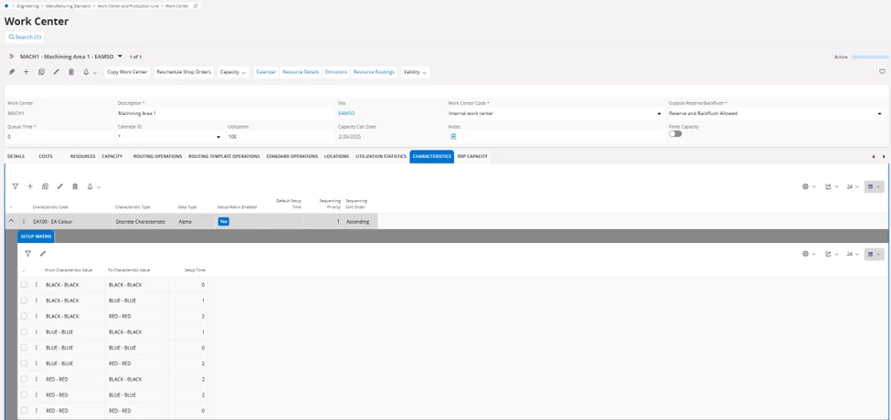 If the objective is to also reduce set-up and changeover time between shop orders, add the Characteristics to the Work Center Characteristics Setup Matrix together with setup times.
