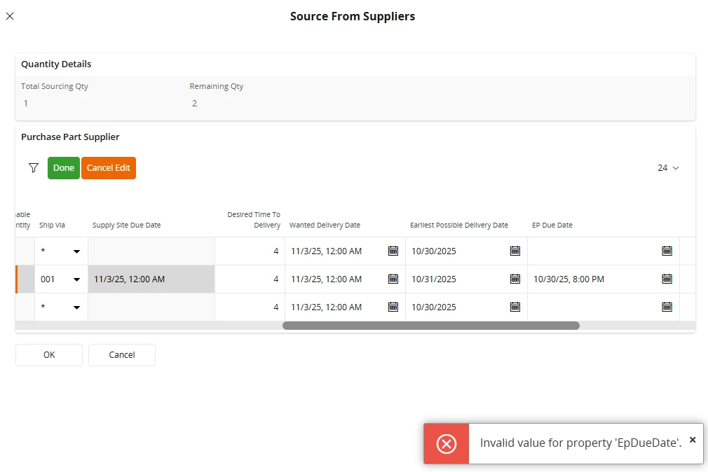 I am running into an issue with timezones when sourcing from an internal supplier manually when I change the ship via code in the “Source from Suppliers” dialog.