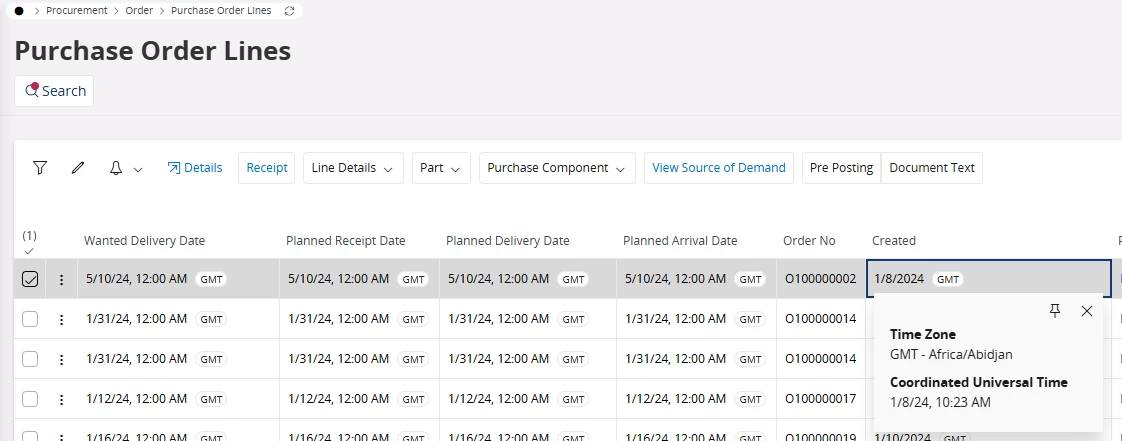 But when the PO and resceipt are created, it is fecthing different time zone which int he dates