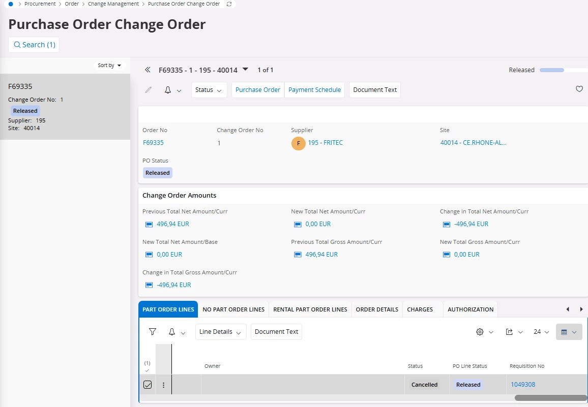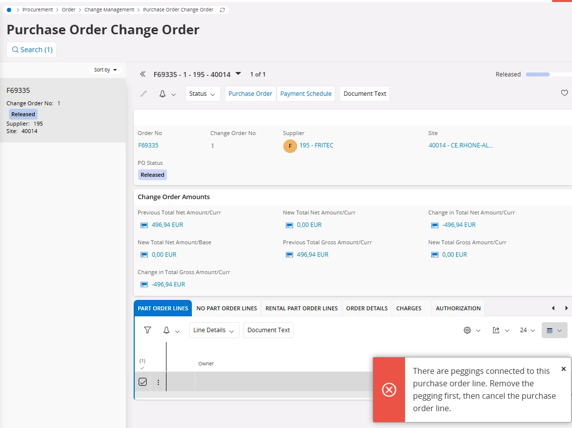 When trying to cancel a Purchase Order Line (via Change Order or direct action) that is connected to a Work Order, IFS Cloud throws the following error:
