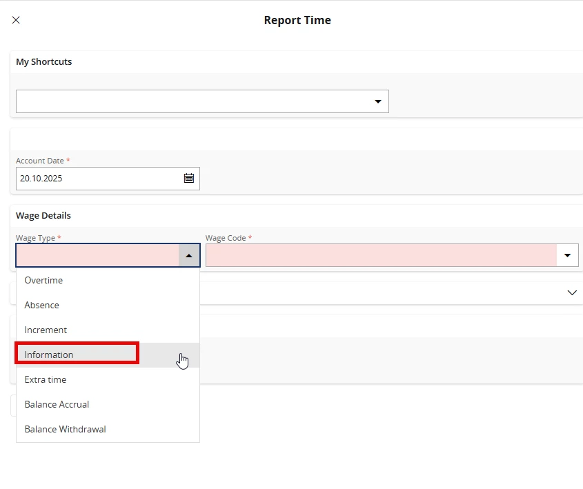 I would like to revoke the time reporting for Work tasks and Project in “My time registration”. Additional I would like t revoke the time reporting for attendance except Wage type “Information”. Goal should be, that it is only allowed to register attendence with wage type “information” in the mask “My time registration”