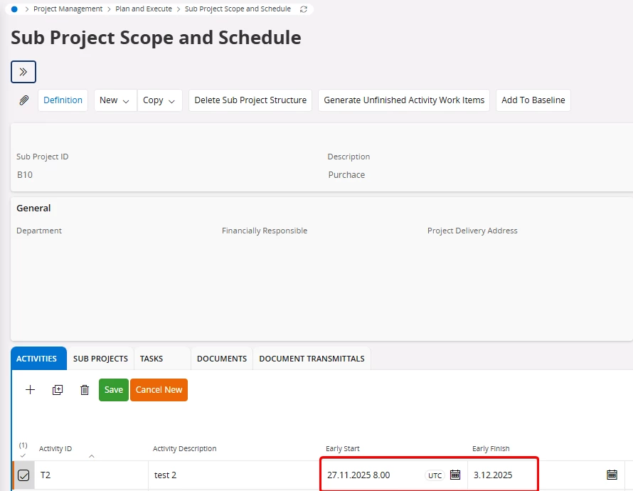 Project activities have early start and early finish dates. The standard format is DD.MM.YYY HH24:MI. Users do not schedule activities on hourly level so I removed the date by changing the “Showonlydate” definition with page designer.