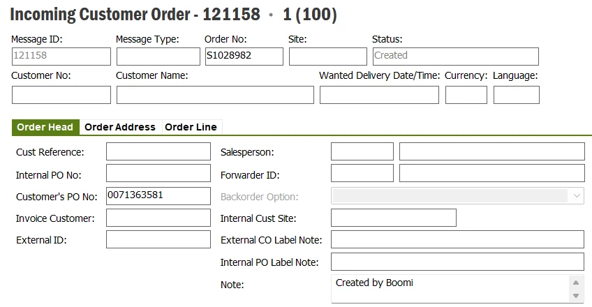 "Attr_" : "MESSAGE_ID\u001F121158\u001EORDER_NO\u001FS1028982\u001ECUSTOMER_PO_NO\u001F0071363581\u001ENOTE_TEXT\u001FCreated by Boomi\u001E"