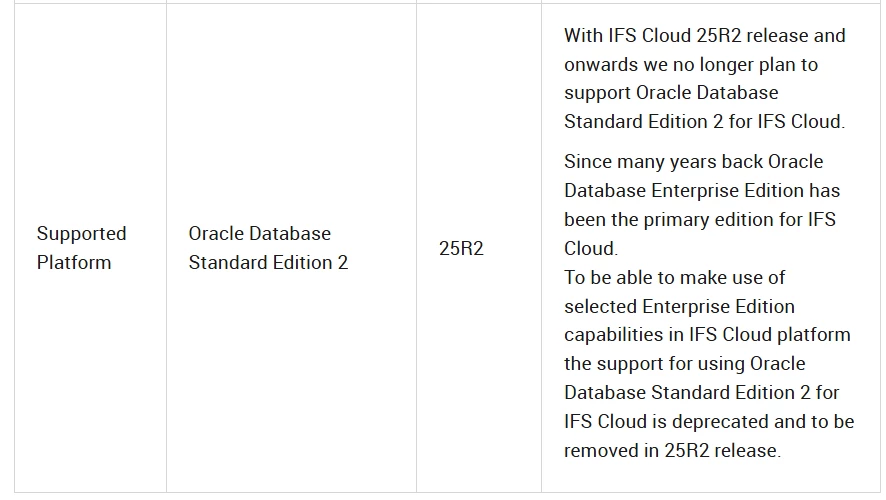 However the IFS Cloud 25R1 Deprecated Features Log announced that SE2 support will become deprecated starting with 25R2 on September 2, 2025, and EE will be mandatory.