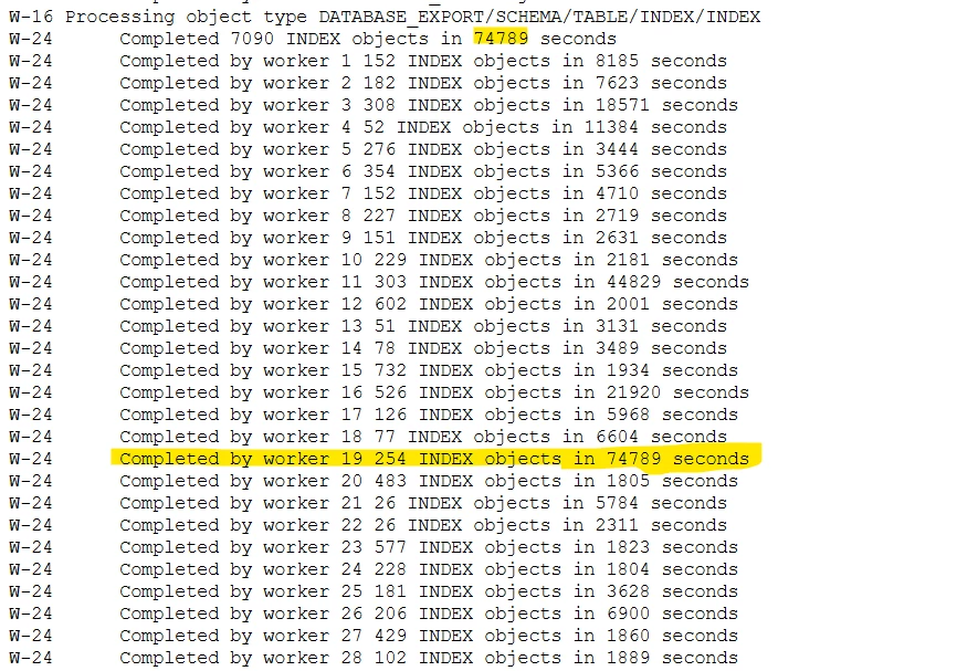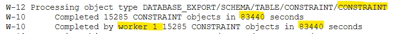 - Within this, importing INDEXES alone consumes around 21 hours, and importing CONSTRAINTS takes about 24 hours.