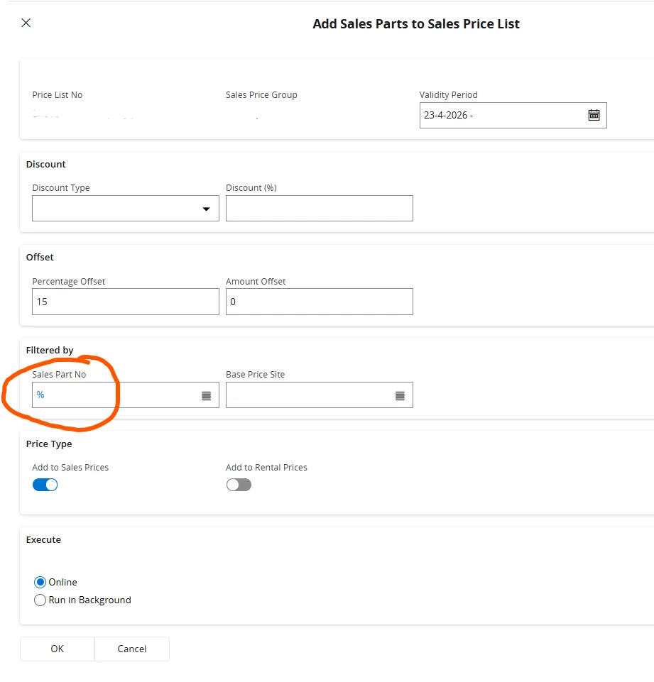 Therefore, this is expected behavior: once “%” or a specific value is initially set in Price List No or Sales Part No, it will not be replaced by subsequently selected values. It seems it is built into the system logic to control how data is selected and processed within the dialog.