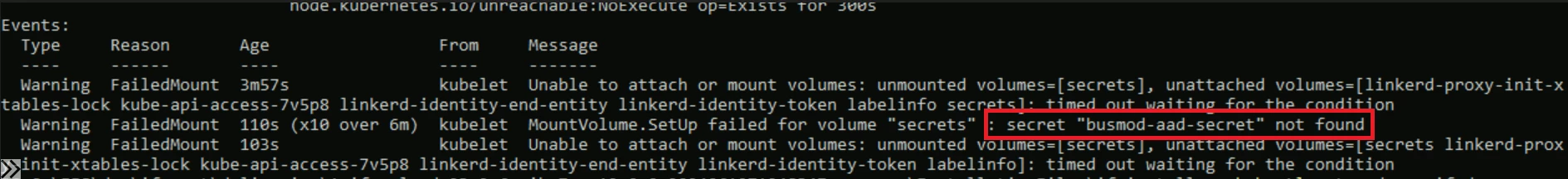 MountVolume.Setup failed for volume “secrets” : secret “busmod-aad-secret” not found